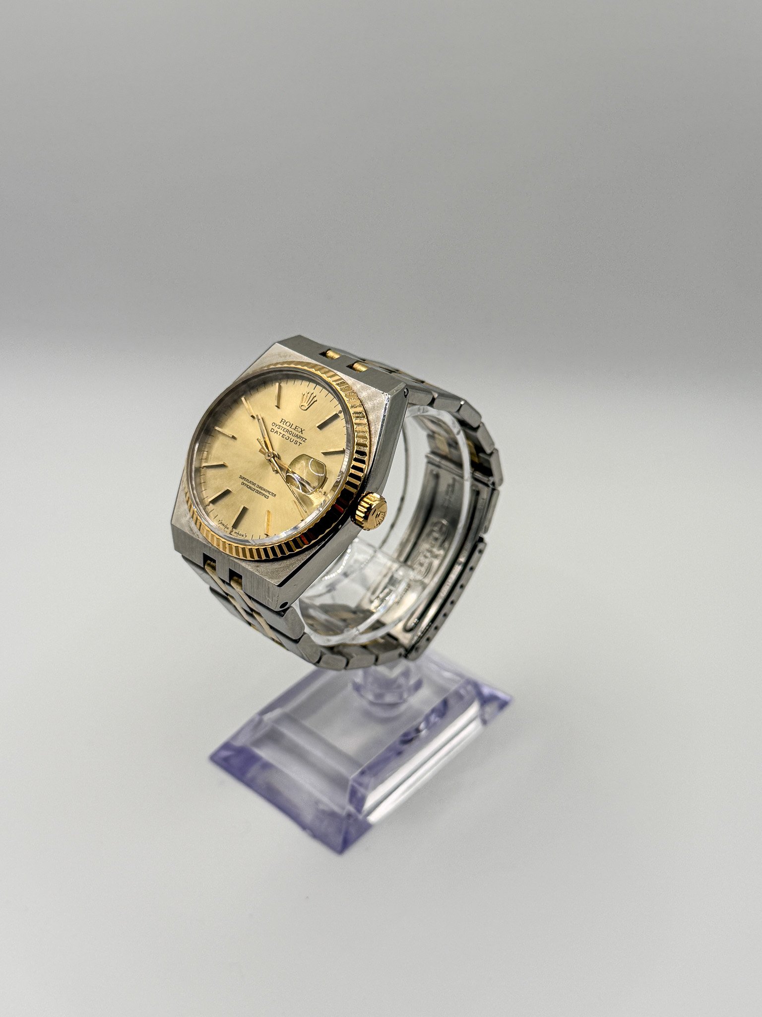 Distinct angular Oysterquartz design from the late 1970s–1980s era, paired with a classic champagne dial configuration.